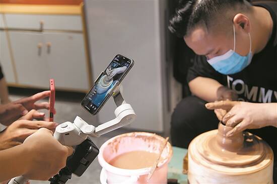 潮州市裕德堂壶艺研究所副所长张泽锋通过网络直播介绍手拉壶制作技艺
