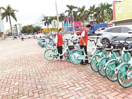 中行珠海分行员工对乱停放的共享单车进行集中治理