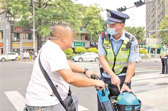 “你好,你骑电动自行车为什么不戴头盔?”骑电动自行车的市民杨先生,因没有佩戴安全头盔被民警拦下。他当场承认了错误,表示愿意接受民警的警告教育。随后,杨先生根据民警指引,来到了学习点进行登记。他选择了成为一位交通安全志愿者,在路口举起印有“遵规守法文明行,交通安全有保障”的警示牌,提醒过往的群众注意出行安全。
