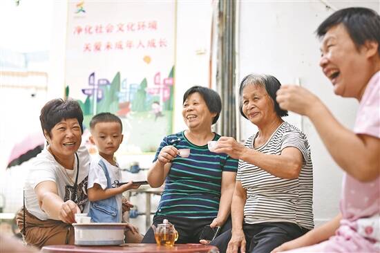 幸福里小区的居民在小区里品着工夫茶闲话家常,脸上洋溢着幸福的笑容
