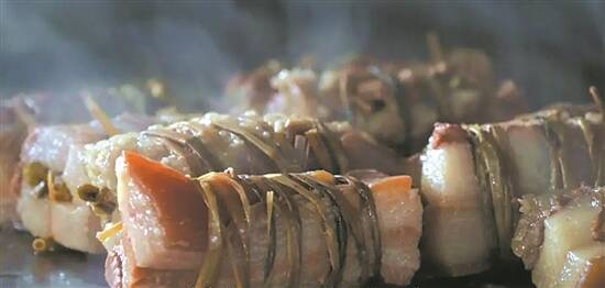 禾秆盖珍珠的做法并不算繁杂。首先,选用肥瘦适中的五花肉切块,中间塞进绿豆,再用禾秆草捆扎,让五花肉夹紧里面的绿豆。然后,放进秘制的酱汁内炖煮。