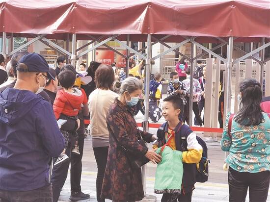 11月8日,记者在禅城区铁军小学门口看到,下午4点30分,依然有不少家长等在学校门口,见到家长的孩子们欢声笑语,身后的书包,似乎也轻了不少。