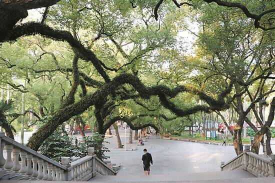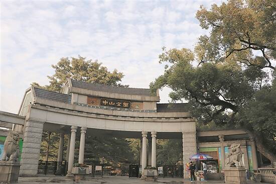 迈入中山公园的南大门,首先映入眼帘的是一棵棵古老的香樟树,枝干蜿蜒、苍劲有力,树冠如云、碧叶成荫。树底下,有老人在练太极拳,有小孩在戏耍……在这里,生活似乎放慢了脚步。
