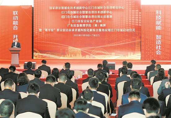 11月18日上午,国家政法智能化技术创新中心江门市域社会治理孵化中心、江门市市域社会智慧治理技术创新中心、江门市市域社会智慧治理应用示范基地、江门市安全应急产业园、广东应急管理学院(筹)揭牌暨“粤平安”群众信访诉求矛盾纠纷化解综合服务应用江门市域启动仪式举行。此外,十多个涉及智慧管理、应急应用等领域的合作项目在启动仪式上签约落地。记者了解到,借助上述中心、平台、基地,江门将打造成为全国社会智慧治理工作的示范基地。