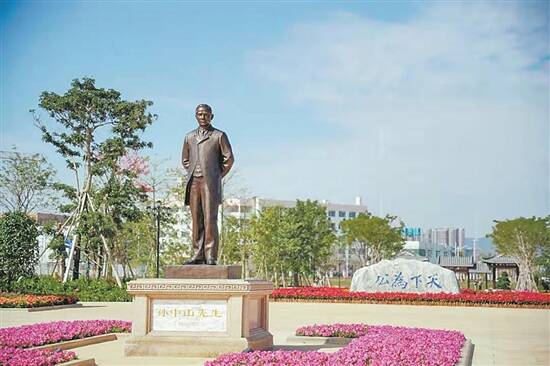 此外,在中山公园二期的核心节点——青年广场,一座由全国政协委员、广州雕塑院院长许鸿飞所创作的“青年孙中山铜像”竖立在此,象征着孙中山先生青年时期从翠亨出发,途经唐家湾奔赴澳门,走向檀香山、走向世界的革命岁月;弘扬了孙中山先生天下为公,为振兴中华而矢志不渝的崇高精神。