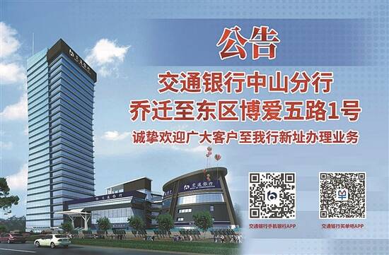 交通银行中山分行于2021年11月22日正式乔迁至中山市东区博爱五路1号。旧址中山市石岐区悦来南路30号自2021年11月19日起不再对外营业。