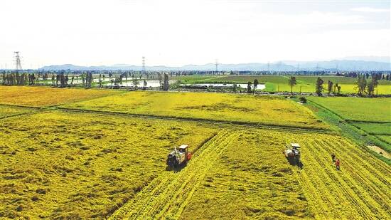 都斛镇省级万亩粮食高产示范片正进入晚稻收割的关键时期,田间地头一片热闹的农忙景象 何允慈 摄