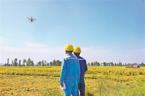 都斛供电所组织人员利用无人机自动巡视技术对涉及秋收用电的线路进行特巡 郑茵茵 摄