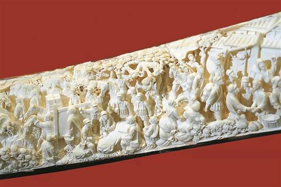要说“得意之作”,何爱群向远处指了指笑称:“近三年的心血,都花在这了。”远看,眼前3米长的巨型牙雕犹如一幅展开的画卷;近看,一个个栩栩如生的人物,连眼里都有戏,正演绎着一部伟大历史故事。