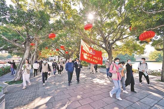 在西湖九曲桥后的园子里,不少惠州市民手握话筒,唱起了歌谣,给静谧湖景增添文艺气息。“新惠州人”杨姨退休到惠已五年有余,她每天都会与好友结伴,从下角家中穿过祝屋巷到西湖晨练唱歌。“这样的退休生活非常舒适、悠然。”她说。