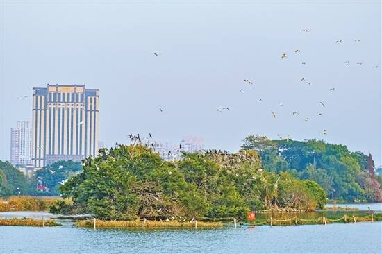 初冬,步入惠州西湖,“玉塔卧微澜”的浪漫美景随即浮于眼前;行舟湖上,碧水泛起涟漪,两旁一片郁郁葱葱,鸟儿们或站在枝头上“打盹”,或盘旋空中,或在湖面上嬉戏打闹。