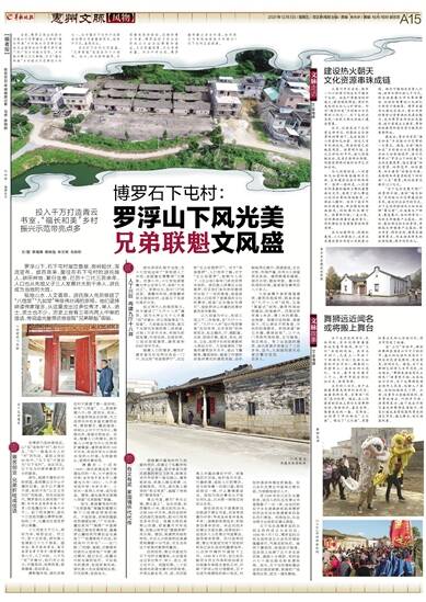 自古石下屯村文风昌盛,“兄弟联魁”佳话至今口口相传。如今,村内宗祠遍布,外观看来保存较好,还拥有青云书室、博罗县抗日民主政府成立大会旧址等革命遗址,文化底蕴深厚,文化资源丰富。作为千年古邑,博罗遍布着众多古村落,如何将文化有效地赋能乡村振兴?石下屯村正在探索。