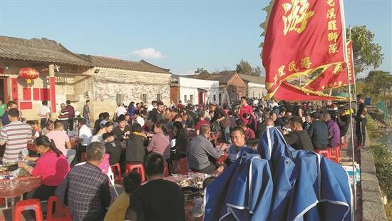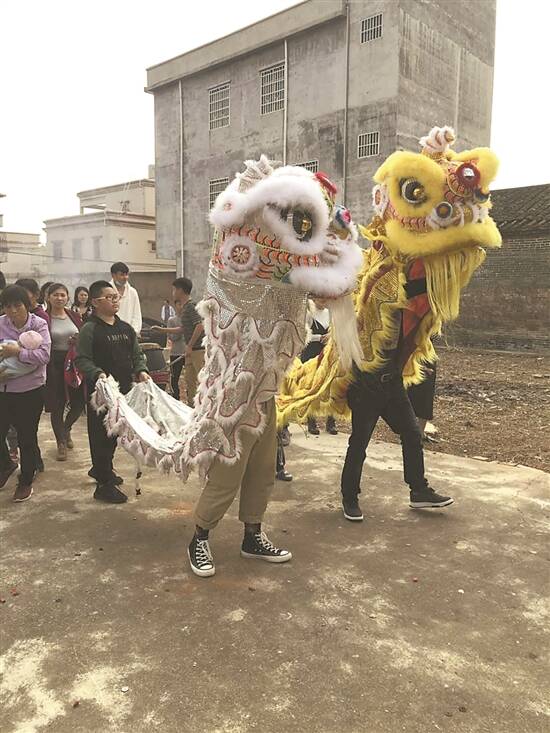 在“上灯”活动中,精彩的舞狮表演是必不可少的环节,盛大的巡游队伍吸引了附近村民前来围观,有说有笑,热闹非凡。据悉,石下屯舞狮已经有几百年历史,远近闻名。“舞狮表演具有本土特色!”游勇明介绍,与其他地方不同,石下屯舞狮表演会使用上农具,还融入了杂技,出招切磋招式了得。此前,还曾多次受邀到深圳、东莞等地演出,叫好声不断。游勇明表示,接下来会不断完善创新舞狮表演技巧,将其打造成具有较高观赏性的演艺节目,搬上舞台,吸引游客观看。