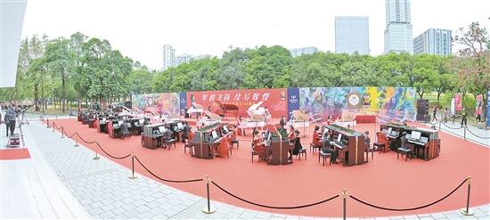12月26日,深圳龙华文化艺术中心广场,51台红白黑三色“恺撒堡”钢琴整齐列阵,100多位深圳优秀钢琴师生在温度剧降的寒流中轮番上演,用热情战胜寒流,用激情澎湃的琴韵,献礼中国共产党成立100周年,歌颂伟大的祖国。