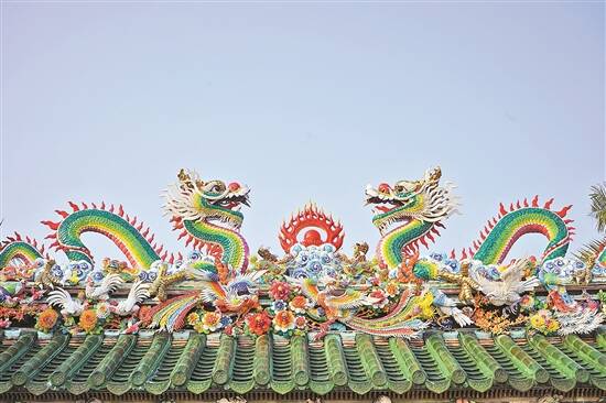嵌瓷,是潮汕地区特有的一种传统民间工艺,它以绘画、雕塑为基础,采用色彩斑斓的釉彩陶瓷片,经剪取、敲制、镶嵌,制作成各种寓意着美好的艺术品,多用于装饰庙宇、祠堂和民居建筑,被誉为“绽放在屋脊上的艺术”。