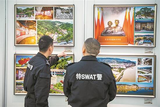 在梅州市公安局二楼大厅,一幅幅红色摄影作品呈现在眼前,民警驻足参观,了解苏区梅州的警史和光荣传统。据了解,这场以“底色”为主题的“梅州公安红色印迹摄影作品展”,通过“红土”“红路”“红枫”“红心”四个篇章,以梅州的红色地图和历年来梅州公安功模先进人物、红色派出所、红色党建等红色摄影作品,全面展示了梅州公安不断探索新时代红色党建之路。