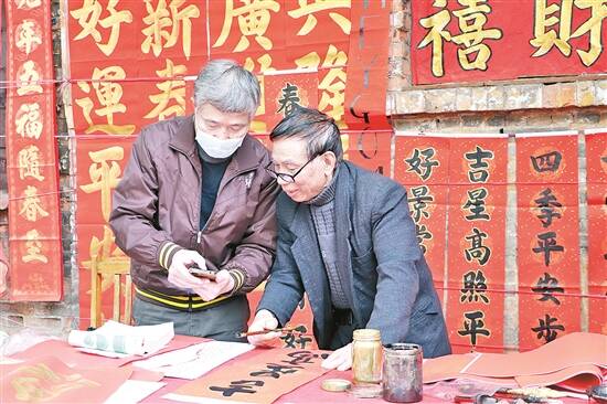 挥春师傅中,有年过七旬、八旬的长者,也有从40多岁到60多岁的中老年人。据说,到了临近春节的日子,学校放假后,还会有一些青少年跟着长辈出来“写着玩”。