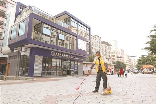 环卫工在长安城管服务驿站门前场地清扫保洁