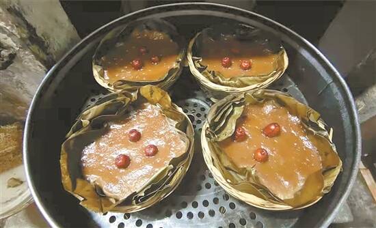 此外,还需在倒粉浆前铺上芭蕉叶和柊叶,增添香味的同时,也可以防止粉团倒进“鱼笼簝”发生漏泄。最后,就可以把“鱼笼簝”放进蒸笼里蒸了。珍姨坦言,“这里最耗时了,需要依据鱼龙的薄厚程度,蒸上6-8个小时。在熟前还需加上一颗红枣在表面,寓意早(枣)生贵子。”