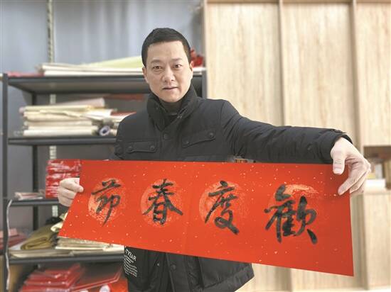 “每天写两个半小时,大概可以写四十副,快的时候一天可以写一百多副。”已经坚持参加送春联活动有二十余年的吴著彬在接受记者采访时打趣说,“现在年纪大了,写春联都要戴上护腰带才行了。”
