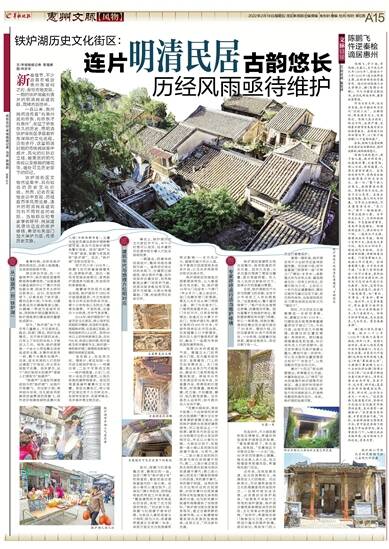 值得一提的是,铁炉湖还有不少尘封历史亟待挖掘传播。刘汉新介绍,和平直翟屋门前原有一座“贞寿之门”牌坊(百岁坊),是乾隆元年为乡饮大宾、翟祖绶妾文氏一百有三岁而立,在惠州较为少见。上世纪七十年代在此建黄楼时,牌坊石被作为基石压在下面,现石构件尚存,当地居民现在还习惯性地将此处称之为“牌坊下”。