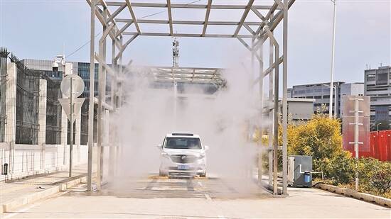 进入接驳站的车辆通过消杀门进行消杀