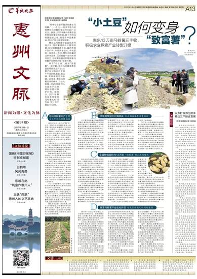 “小土豆”变身“致富薯”——近年来,惠东冬种马铃薯产业发展带动了运输、电商等多种业态。据统计,2021年惠东冬季播种马铃薯大约13万亩,平均亩产约6000斤,总产量近40万吨。每年播种、采收时期,种植大户还会聘请村民帮忙,拉动了农村人口就业。