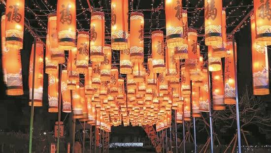 秘境中还加入了绚丽而梦幻北极光,在朦胧轻雾中,北极光与点点萤火相互融合,营造出多维的炫酷空间,仿如一条时空隧道,能穿越到各种光影秘境中,奇幻而浪漫。进入近200米的时光隧道,一眼望去尽是“彩虹”。如同星际穿梭一般,给人一种如梦如幻的感觉。千余盏红灯笼搭建起百米“幸福长廊”。形状各异、颜色鲜艳的彩灯,组成一条别具特色的长廊。抬头仰望,满目都是喜气洋洋。