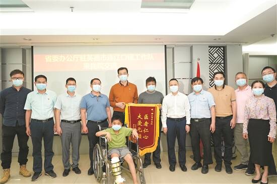 省委办公厅-恒健控股公司驻连江口镇帮镇扶村工作队队长黄江波代表工作队对佛山市中医院对连江口镇村民提供的医疗帮助表示由衷感谢,并现场向佛山市中医院送上了锦旗。“从小的方面来讲,你们改变的是小豪个人和家庭的问题,从大方向来讲,这个爱心接力的故事已经在连江口镇广为流传,温暖了千家万户。”黄江波表示,希望通过各方接力,共同打造出广东乡村振兴的样板,探索出乡村医疗振兴的经验,回应老百姓的期盼与期待。