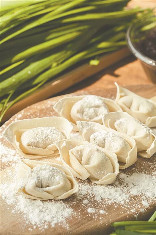 做刀鱼馄饨不算简单。首先将鲜刀鱼制馅儿,也是个精细的大工程,只能人工完成。一切两半,去除中间的骨刺,再剁成肉泥,手工制作的好处,不仅比机器剔得更加干净,而且鱼肉也会更细腻。制作馅料的过程中,加入了新鲜的猪肥膘,可以激发鲜气;加入啤酒,是当地人代代相传的传统,能让馅料的味道更香醇。之后,撒入切好的头茬春韭,这一抹翠绿色的加入,不仅让舌尖的体验更鲜美,更提升了馄饨馅儿的颜值,能瞬间唤醒春天。