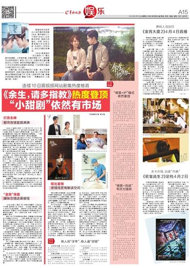 《余生》是典型的“知名演员+IP”模式都市言情剧。从数据来看,该剧非常能“打”。据猫眼专业版数据显示,截至3月24日,该剧的单日播放量呈逐日上升趋势,腾讯视频播放量已达15亿次,连续10天位列视频网站剧集热度榜首,力压同期开播的《与君初相识》与《心居》。