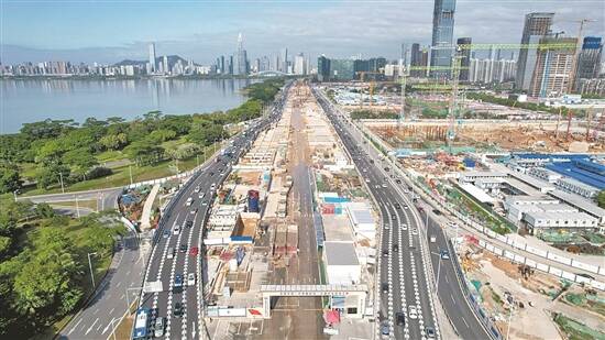 而在深圳湾超级总部基地吊塔林立,这里正在建设深圳7大总部基地之一。“未来城市会客厅”之中,一个“地面+地下四层”的超级交通枢纽正在建设。这是滨海大道(总部基地段)交通综合改造工程,项目地下布局规划五线六站超总枢纽,穗莞深城际超级总部站、地下港湾式公交停靠站和市政隧道在此汇聚,有力支撑超总基地高强度开发。深圳前瞻运用地下空间多系统统筹开发理念,探索超大城市新片区发展新模式。