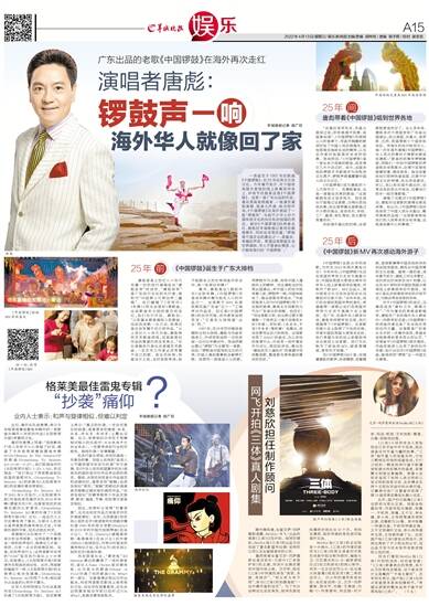 一首诞生于1997年的歌曲《中国锣鼓》,在25年后再次引发讨论。今年春节前夕,在中国驻英国大使馆的线上新春招待会上,开场节目就是这首《中国锣鼓》。这是一首广东出品的作品:著名男高音歌唱家、一级演员唐彪演唱,施凌儿作曲,陈洁明作词。《中国锣鼓》在海外掀起了一股“锣鼓热”,勾起不少华人对中国传统文化的向往和对祖国的思念。面对《中国锣鼓》的再度走红,唐彪对羊城晚报记者坦言颇感意外,同时也非常欣喜:“锣鼓是中国文化的象征之一,是喜庆、幸福的声音。希望这首歌能在全世界唱响,华人不管身处哪里,心中都有我们的‘中国锣鼓’。”