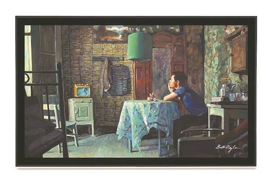 以《春光乍泄》为场景的油画则被命名为《TV Screen》。张国荣饰演的何宝荣坐在位于布宜诺斯艾利斯的房间里,孤独地抽着烟。
