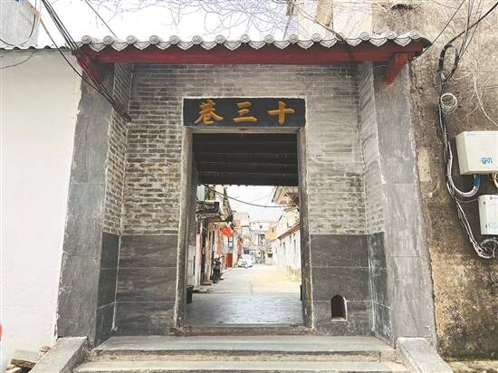 南门巷北端通往老城十三巷,巷口修筑起了一个青石材质的门楼,上书“十三巷”。记者在巷道两侧看到不少祖屋宗祠,在后人的悉心修缮下古韵犹存。