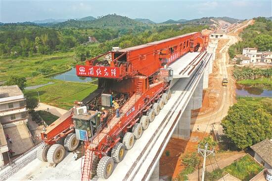 羊城晚报讯 记者王磊,通讯员李长海、赵鹏摄影报道:4月24日,自重达530吨“大国重器”SLJ900运架一体机载着全长32.6米、重达790.3吨的一孔箱梁,从梅龙铁路五华项目部制梁场出发,以每小时3公里的速度,往龙川方向罗洞坑特大桥继续它的架梁任务,经过一个多小时的运输,两个多小时的施工作业后,预制箱梁安稳落于桥墩之上,梅龙铁路又向前迈进了一小步。