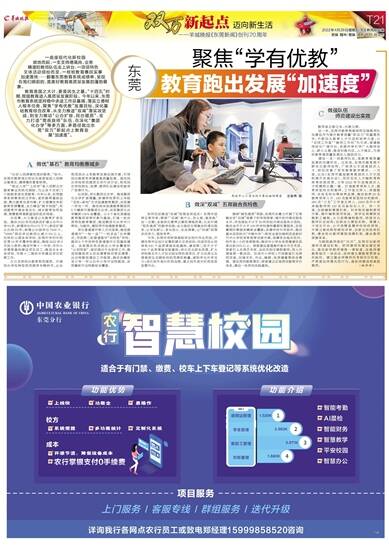 “就近入学”“上好学”是人民群众对教育事业的热切期盼,为让孩子在家门口就能享受优质教育,今年以来,东莞教育系统聚焦民之所盼,紧抓教育基础设施,聚力教育优质均衡,扩大普惠性学前教育资源覆盖,全力铺设“数字校园”,形成教育环境全面优化、城乡教育协同发展、智慧教育高歌猛进的良好局面。