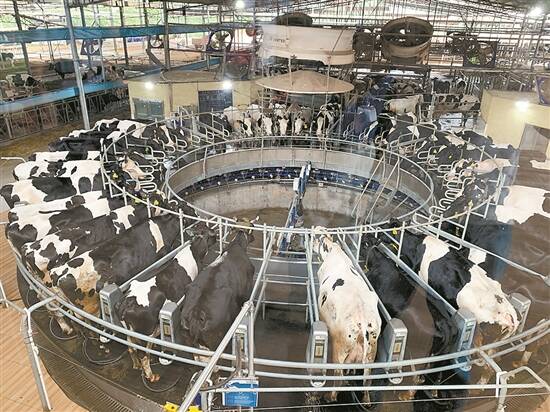 不仅如此,马冈镇还拥有一座面积达6000平方米,拥有数千头荷斯坦黑白花奶牛的牧场。该牧场位于马冈镇黄屋村委会,由开平市粤顺牧业有限公司投资建设。记者日前前往该牧场采访,只见牧场中心有一座转盘挤奶系统,奶牛随着系统转动慢慢进入系统隔栏内,工人们为奶牛装上挤奶设备,等系统挤到一定量的鲜牛奶后,设备自动脱落,工人们便对奶牛进行消毒、护理。最后,奶牛又从出口处有序回到牛棚。场长张宝生告诉记者,公司投资约400万元引进这套设备,提高产奶效率。“现在,我们牧场的母牛年单产鲜牛奶水平超过10吨,在广东奶牛养殖业界属于较高的饲养水平,乳脂肪、乳蛋白、菌落总数等各项指标均优于国标水平”。
