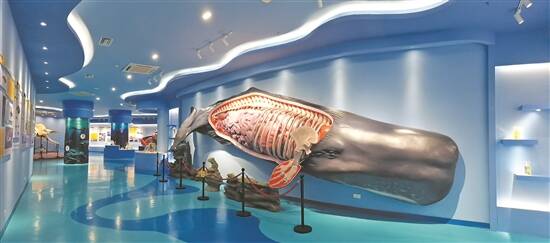 馆内最吸引人的莫过于那一具庞大的抹香鲸标本——当初在大亚湾海域搁浅的抹香鲸,仿佛在展厅中得以“重生”。