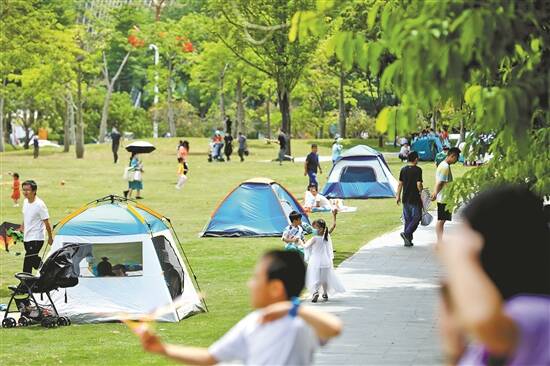 一顶帐篷,一个野餐垫,摆上各色零食餐点饮料,有市民还把帐篷精心装饰,露营、拍美图两不误,在都市里也能享受浪漫的田园生活。五一假期,深圳公园总客流量达到228.8万人次。坐拥秀美海岸线的“大热门”深圳湾公园,五一期间人流量甚至达到20.6万人次。在“露营热”的席卷下,许多市民兴致满满地加入这场公园游玩“新时尚”。