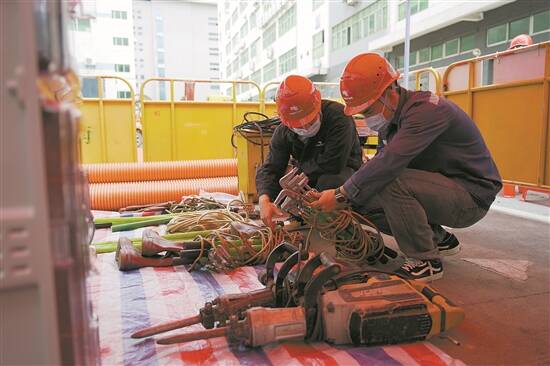 5月24日,在宝安区华丰科技园内,卷扬机轰隆隆的声音打破了往日的平静,一群穿着南方电网字样服装的工作人员正在有条不紊地开展供电改造。据悉,深圳市政府已印发了924个像华丰科技园这样需要升级改造的工业园区清单,从当日起都将陆续开工。