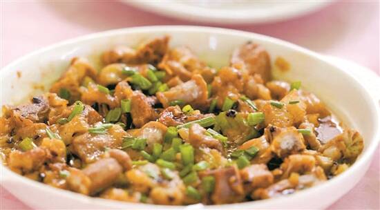 排骨粉肠要做得好,第一排骨要炖得酥烂入味,第二粉肠在吸收排骨精华后依然保持弹牙有嚼劲。不以爆炒或辅助佐料来达到“辟腥”的目的,他的“排骨粉肠”看上去干干净净、清清淡淡,吃上去却是保留了粉肠和排骨最本质的味道。粉肠脆嫩爽口、排骨肉汁饱满,几乎是最简单的加工方式,最为普通的配料却保留了食材的原汁原味。
