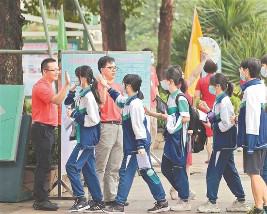 佛山市三中考点,师生击掌鼓劲 羊城晚报记者 梁正杰 摄