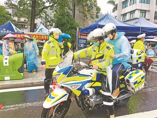 13时50分许,一名考生急匆匆跑过来,向二中门口执勤点的交警求助,称其需要回家拿准考证和身份证。香洲大队林警官随即从爱心服务站拿来一次性雨衣,并找来头盔拿给考生。随后由辅警小吴驾驶警用摩托车送考生到吉莲新村的家中取证,拿到证件后,又一路争分夺秒返回考点。最后顺利在14时20分将考生送达考点,考生得以顺利参加考试。