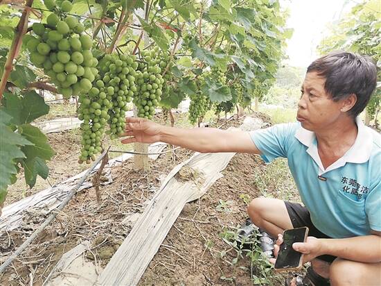 农技人员送农业科技下乡的好处远不止于此。2021年6月,丁凤贤的葡萄被人误打除草的药水,面临绝收的危险。紧急关头,丁凤贤想到了东莞市农技和农科中心的专家。“一个电话后,他们就马上赶过来了,并带来一种药水,给‘中毒’的葡萄打上。”至今回忆起来,丁凤贤都感谢不已,他说:“葡萄就像是吃了‘解药’一样,很快就复活了80%,为我挽回了几十万元的损失。”