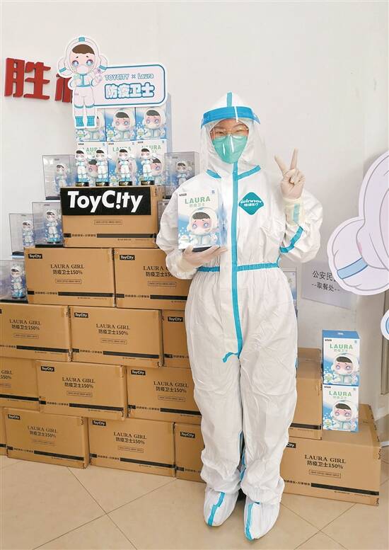 拿到“LAURA防疫卫士”潮玩纪念手办后,23岁的医护人员萧美琪将其摆放在床头,每晚睡觉前都会看看。她说:“身穿防护服、戴着口罩、手拿体温枪与登记表的卡通‘防疫卫士’像极了工作中的自己,从它的眼睛里我能感受温暖,汲取力量!”