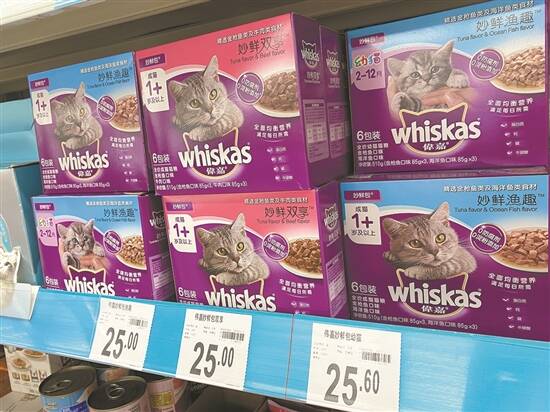 超市在售的伟嘉牌猫粮,种类较丰富