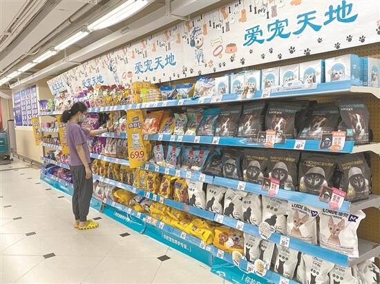 顾客在超市的宠物食品货架前挑选产品