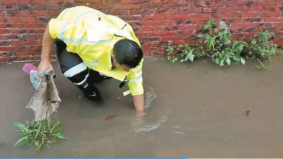 袁凯徒手清理排水口杂物