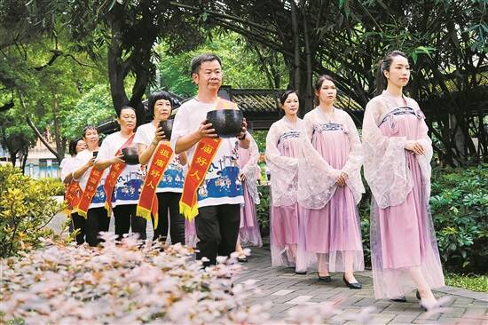“塔坡井起水啰!”在一声响亮而悠长的呼喊声中,打水人将木桶伸入井中,装满井水,缓缓取出水面,倒入铜磬里。然后,装有塔坡水的铜磬,从6名护水人手中传递到塔坡片区原居民代表手上,开启了接力传递……这是本次塔坡庙会文化艺术周“传递塔坡井水”仪式中的一幕。在传递塔坡井水的过程中,6个传水方阵、36名传水人,用生动古朴的方式演绎了源远流长的民俗。传水人中,有来自鸿胜武馆的代表,有“祖庙好人”、青少年代表,也有本地企业家、非遗传承人代表,象征着塔坡水孕育佛山百业。